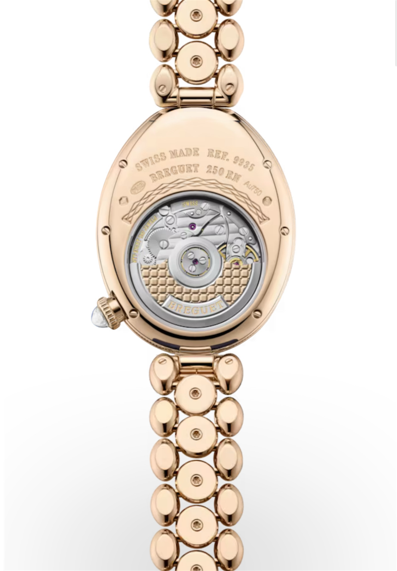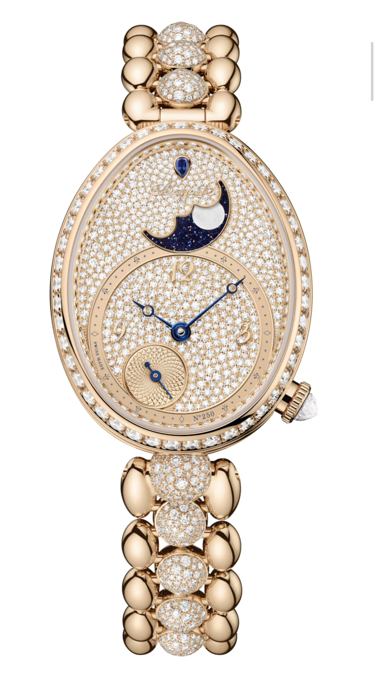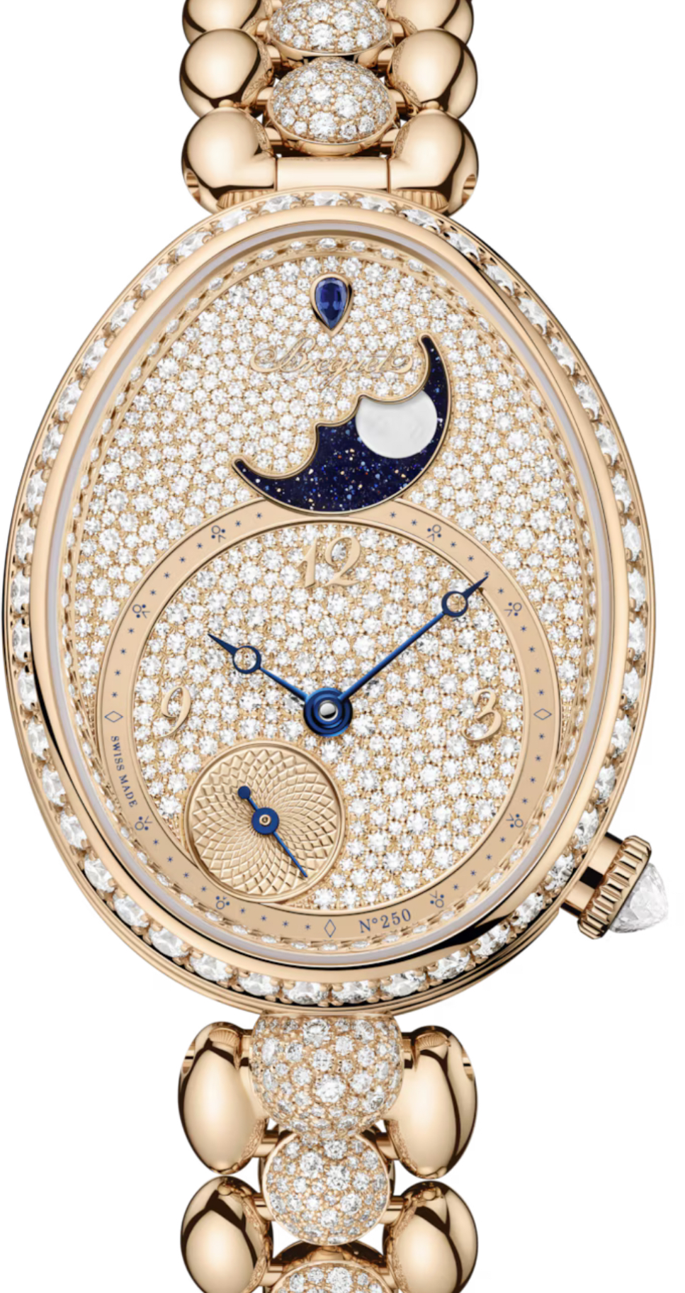 Эти мечтательные часы с фазами Луны заключены в корпус из золота Breguet размером 28,5 мм в ширину и 36,5 мм в длину. Заводная головка в положении «4 часа», сверкающая блеском 109 бриллиантов классической огранки, украшает безель и фланец. Заводная головка в положении «4 часа» украшена крупным бриллиантом огранки «бриолет»