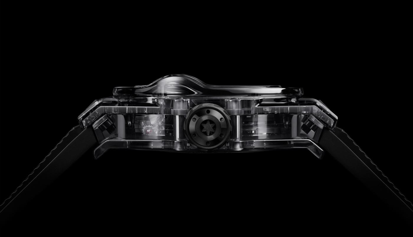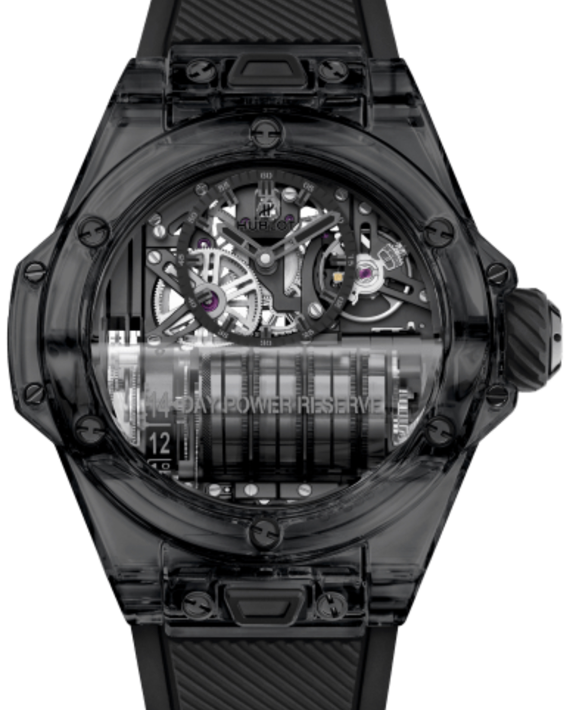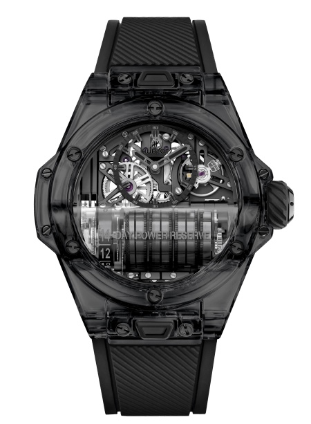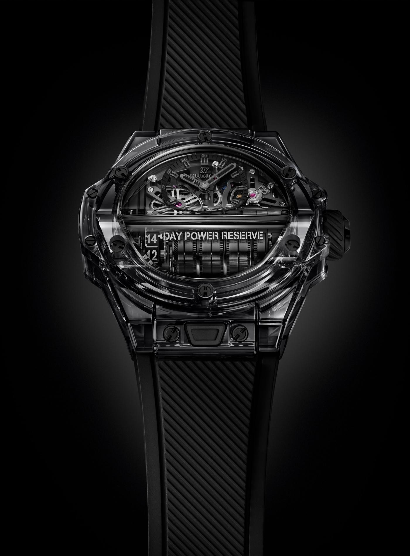 В 2025 году бренд Hublot представил новый корпус из черного сапфира в своей сложной модели часов MP-11 14-Days Power Reserve Black Sapphire 45 mm