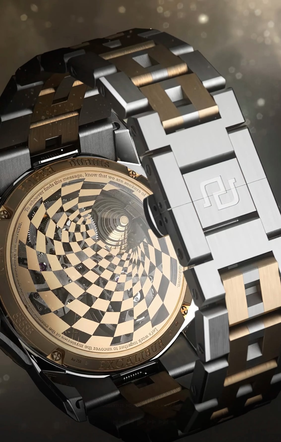 Корпус Excalibur диаметром 42 мм сочетает в себе легкий титан с 18-каратным розовым золотом для безеля и задней крышки. Он имеет чередующиеся полированные и сатинированные отделки, фирменную заводную головку с защитой и гравированные символы доктора Ву на безеле и средних звеньях браслета из титана и золота. Задняя крышка из сапфирового стекла демонстрирует расходящийся шахматный мотив и гравированное сообщение по краю: Давайте работать вместе, чтобы раскрыть тайны космоса и раскрыть секреты вселенной. Часы водонепроницаемы на глубине 100 м.