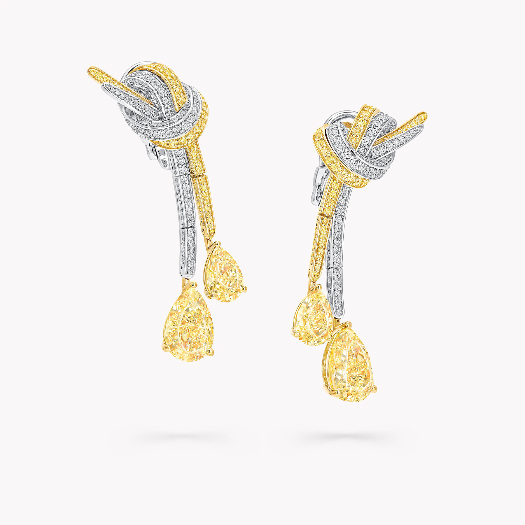 Пара изысканных серёг Tilda’s Bow High Jewellery воплощает искусство движения и света. Изогнутые линии из белых и жёлтых бриллиантов паве, общим весом около 11,95 карата, плавно переплетаются в утончённый узел, завершаясь элегантным акцентом — четырьмя фантазийными жёлтыми бриллиантами грушевидной формы, сияющими на концах композиции.