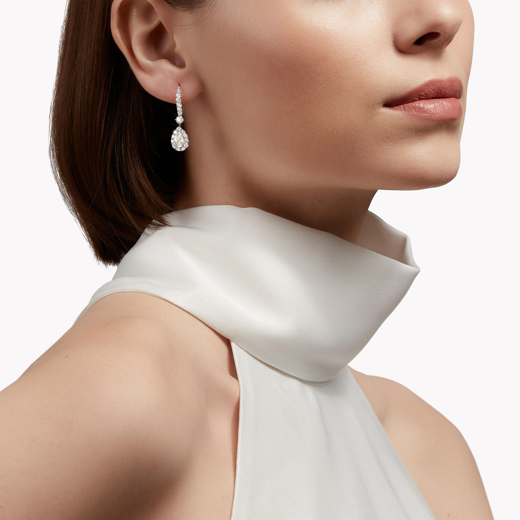 Ослепительное сияние грушевидных бриллиантов раскрывается в серьгах Graff Icon, где каждое движение наполняется игрой света и изяществом формы. Два центральных камня, обрамлённые утончённым ореолом из бриллиантов pavé, излучают чарующее внутреннее сияние, которое усиливается при каждом повороте головы. Подвесы с плавными линиями, украшенные дополнительным рядом бриллиантов, придают композиции грациозность и утончённость.
