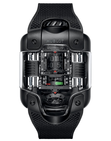 Як і багато годин Hublot, MP-10 не має циферблата. Однак, на відміну від більшості годинників Hublot, у них немає стрілок. Замість цього вони оснащені чотирма циліндричними індикаторами, що постійно обертаються, розташованими посередині унікального корпусу у формі подушки. У верхній третині циферблата розташовані два диски, що відображають годинник і хвилини, які оснащені невидимим збільшувальним склом для кращої читання та червоними алюмінієвими стрілками для позначення часу. Нижче розташований круглий індикатор запасу ходу з прозорими зеленими і червоними зонами, що показують заряд, що залишився.