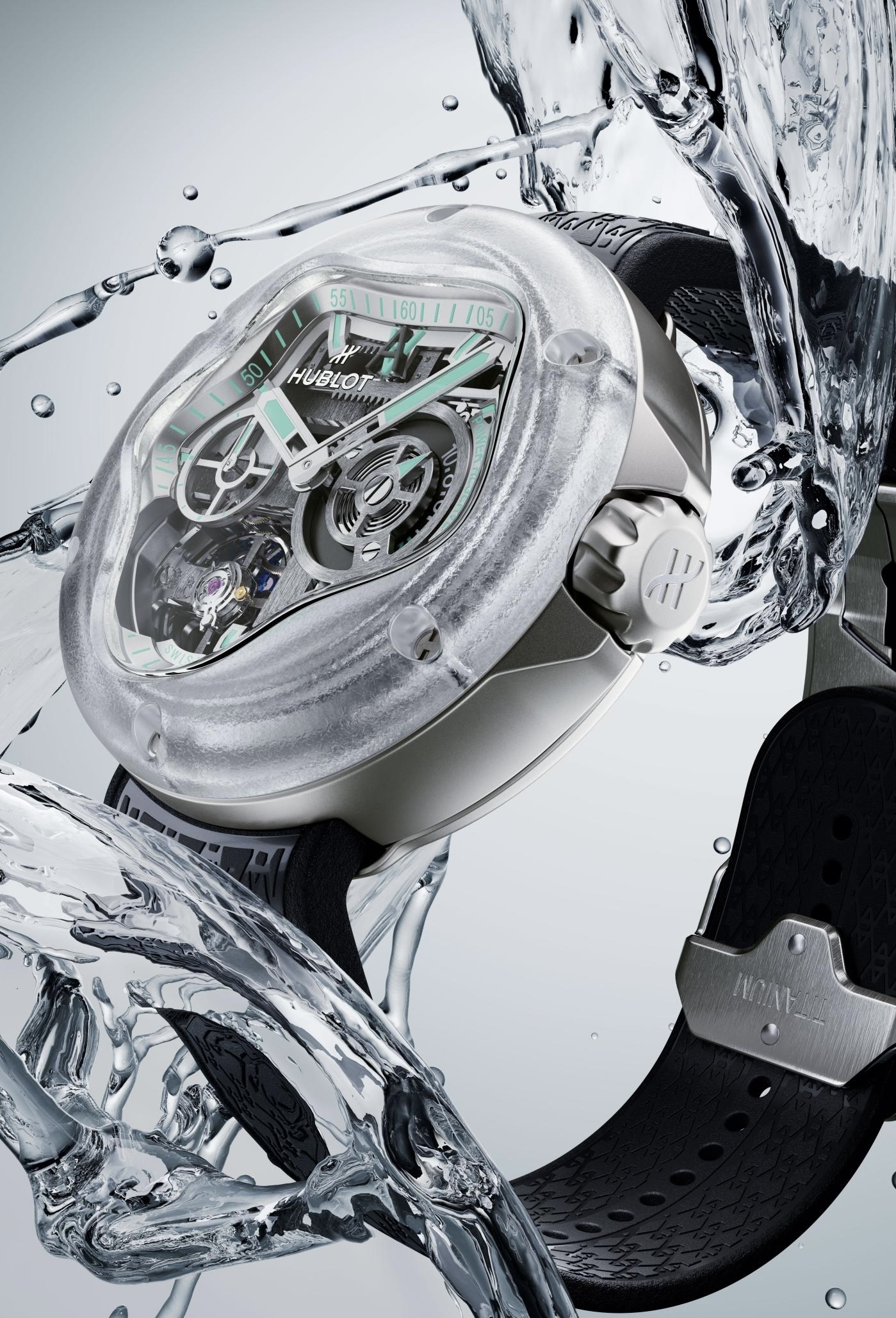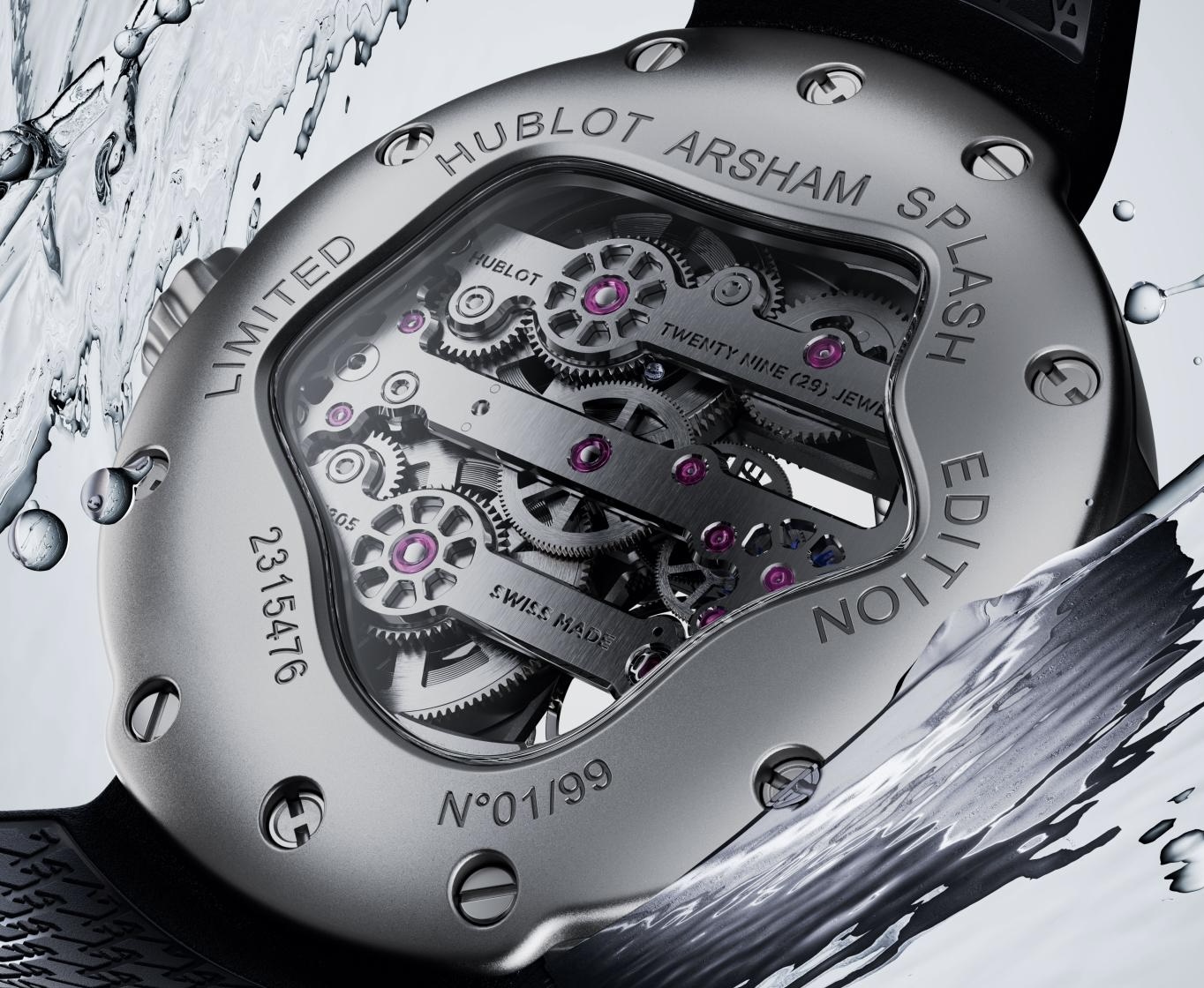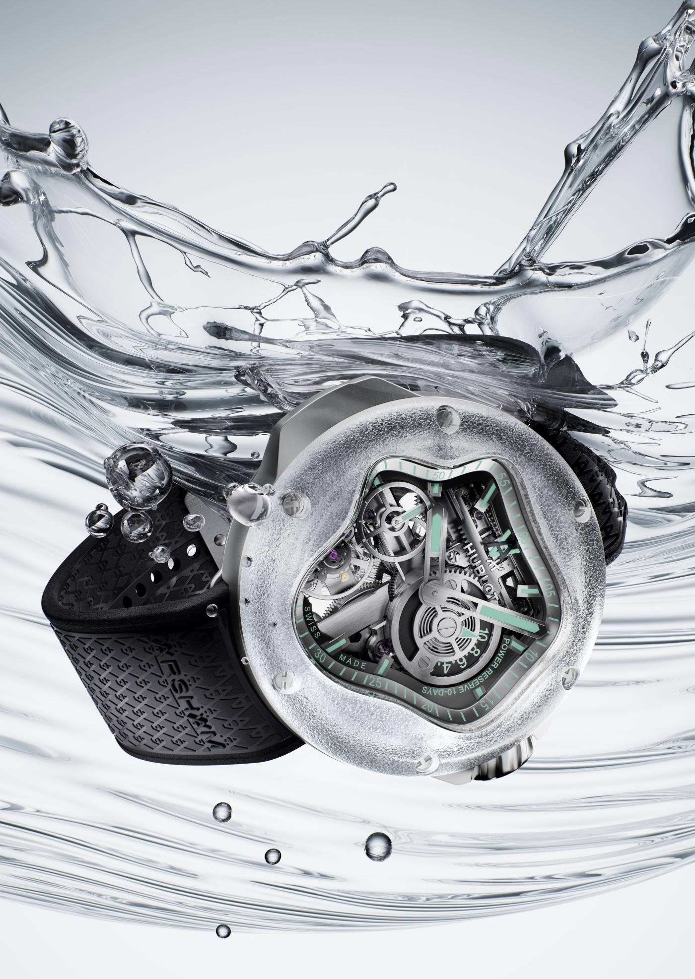 Час пульсує, розбивається вщент і перетворюється в останній творчій співпраці Hublot з американським художником, що працює в різних галузях мистецтва, Денієлом Аршамом. Якщо їхнє попереднє творіння – трансформований годинник MP-16 Arsham Droplet – являло собою переосмислення кишенькового годинника як футуристичного артефакту, то новий MP-17 Meca-10 Arsham Splash Titanium Sapphire відбиває мить сплеску, застиглого в русі. Вони перетворюють ефемерну плинність води на тверду форму, прозорість – на архітектуру, а механічну точність – на скульптурну поезію.