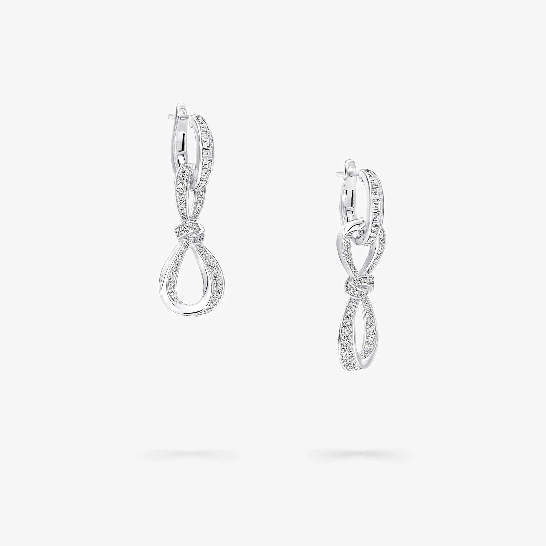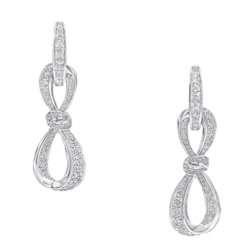 Сучасне прочитання колекції Tilda's Bow відбито у цих сережках, де витончені лінії банта, викладені круглими діамантами паві, переплітаються з овальними ланками. Кожна ланка прикрашена старанно підібраними багетними діамантами, закріпленими вручну у вишукані композиції.