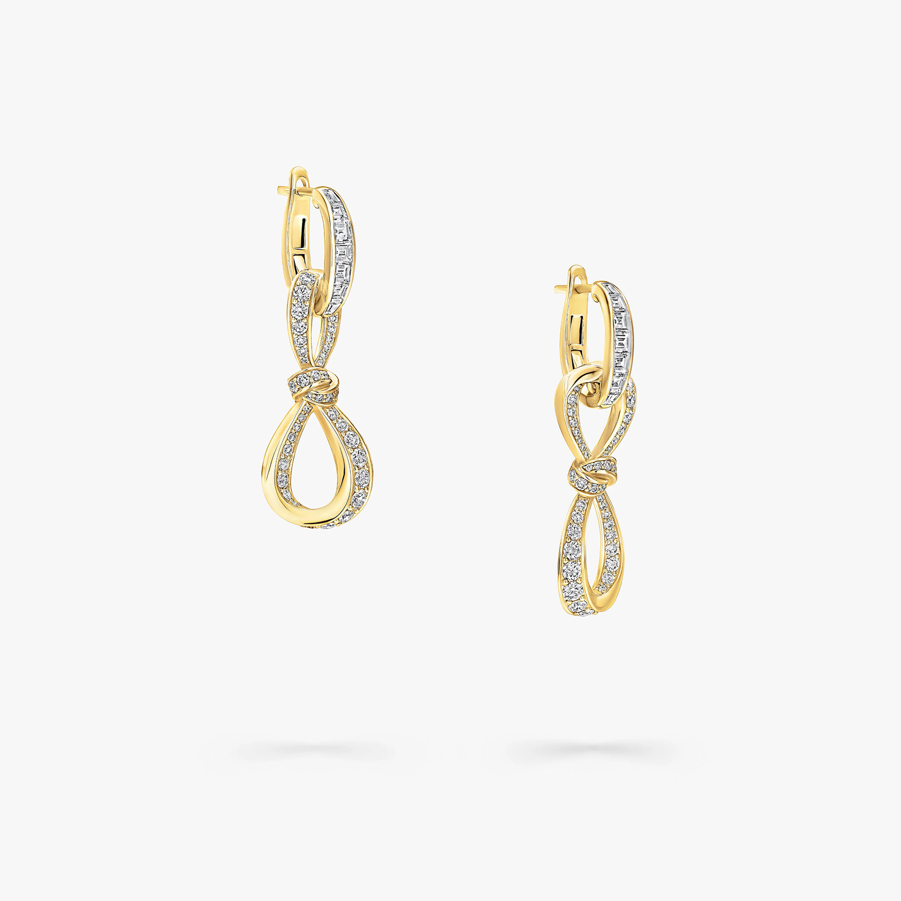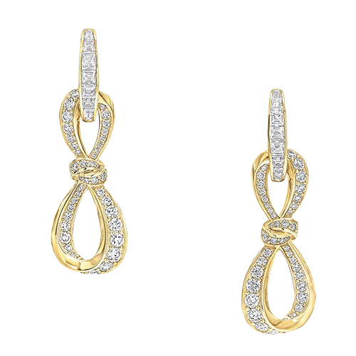 Сучасне втілення колекції Tilda's Bow представлене в цих сережках, де витончені лінії банта, посипані круглими діамантами паві, поєднуються з овальними ланками. Кожна ланка прикрашена багетними діамантами, закріпленими майстрами Graff вручну в деталізовані композиції.