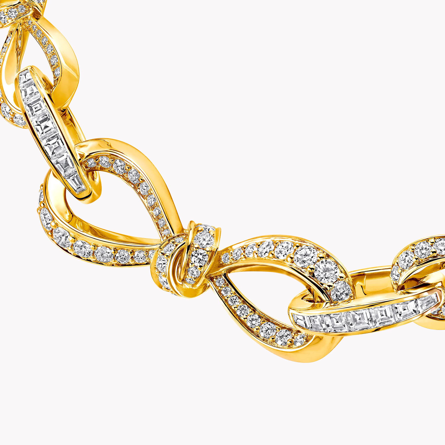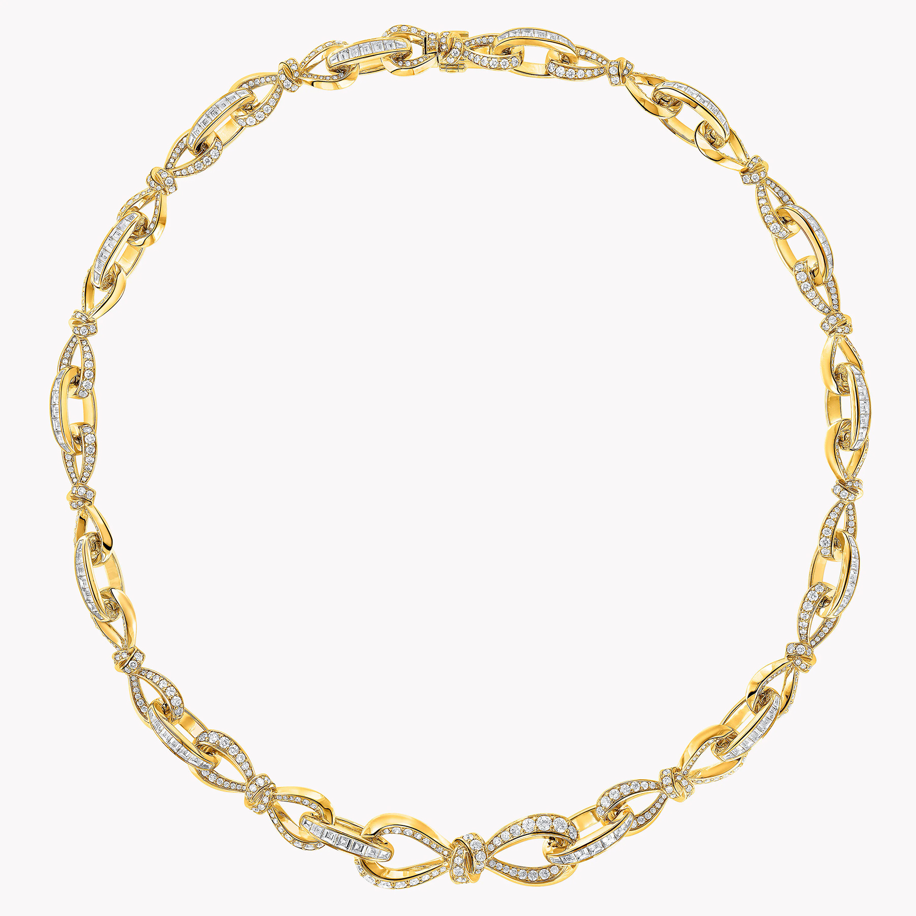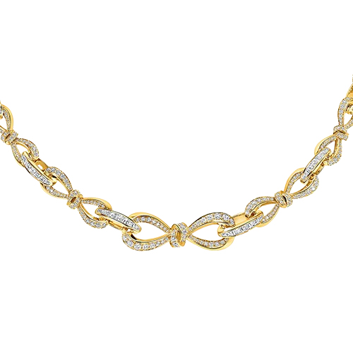 Сучасна інтерпретація колекції Tilda's Bow втілена в цьому намисто, де витончені лінії банта, інкрустовані круглими діамантами паві, гармонійно переплітаються по всій довжині виробу. Їх поєднують овальні ланки, прикрашені вручну закріпленими багетними діамантами, зібраними в витончені композиції.