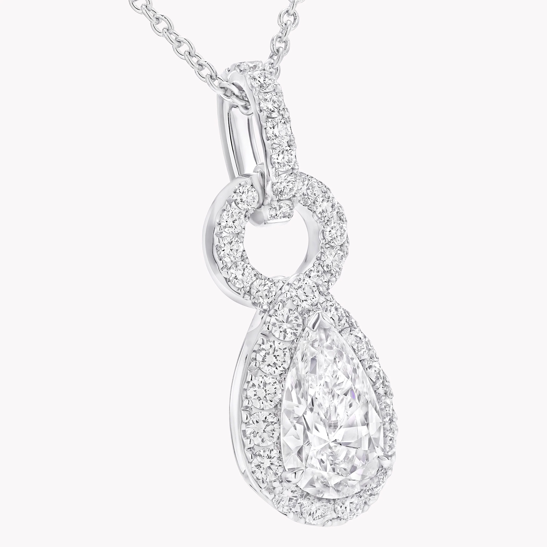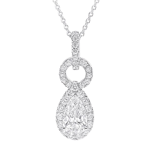 Один діамант грушоподібного огранювання укладений у вишуканий ореол з діамантів паві в підвісці Icon 8. Елегантний силует прикраси плавно з'єднаний з двома петлями, посипаними діамантами - одна з них показана у профіль, а інша у фронтальному вигляді, що надає прикрасу.