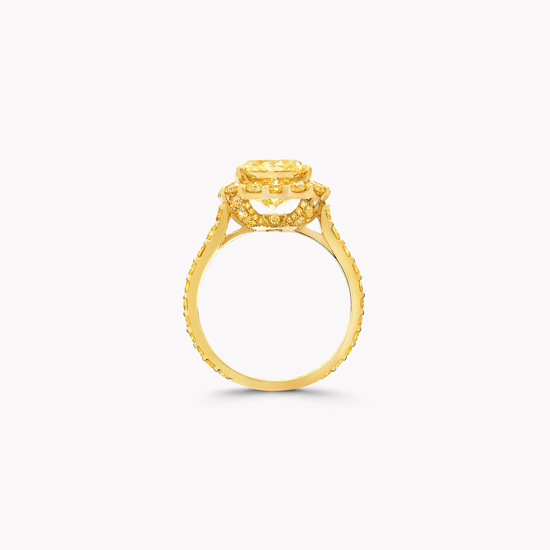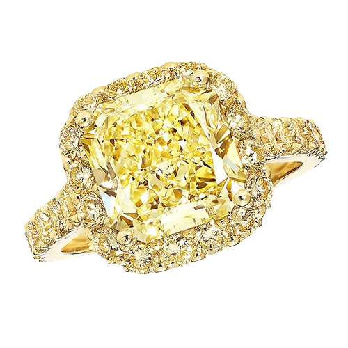 Яскраве і живе кільце Icon з діамантом огранювання «радіант» та жовтим паве загальною масою близько 2,53 карата, прикрашене сертифікованим діамантом Fancy Vivid Yellow вагою 1,23 карата, — це квінтесенція світла, розкоші та бездоганного.