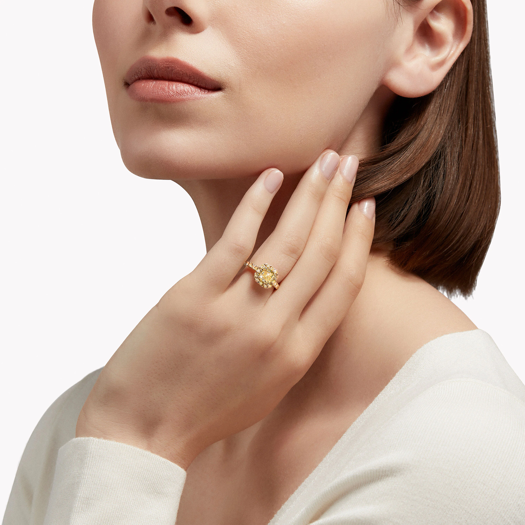 У центрі кільця Icon сяє рідкісний діамант ограновування «радіант» насиченого відтінку Fancy Vivid Yellow — один із найяскравіших і найживіших тонів у світі природного каміння. Це ограновування, що поєднує елегантну геометрію смарагду та сліпуче сяйво круглого діаманта, відоме своєю винятковою грою світла та глибиною блиску. Навколо центрального каменю мерехтить ореол з діамантів паве в сонячних жовтих відтінках, майстерно підкреслених оправою з жовтого золота, що посилює сяйво та насиченість кольору.