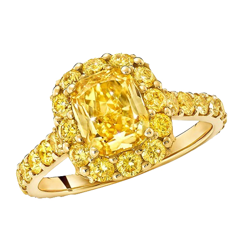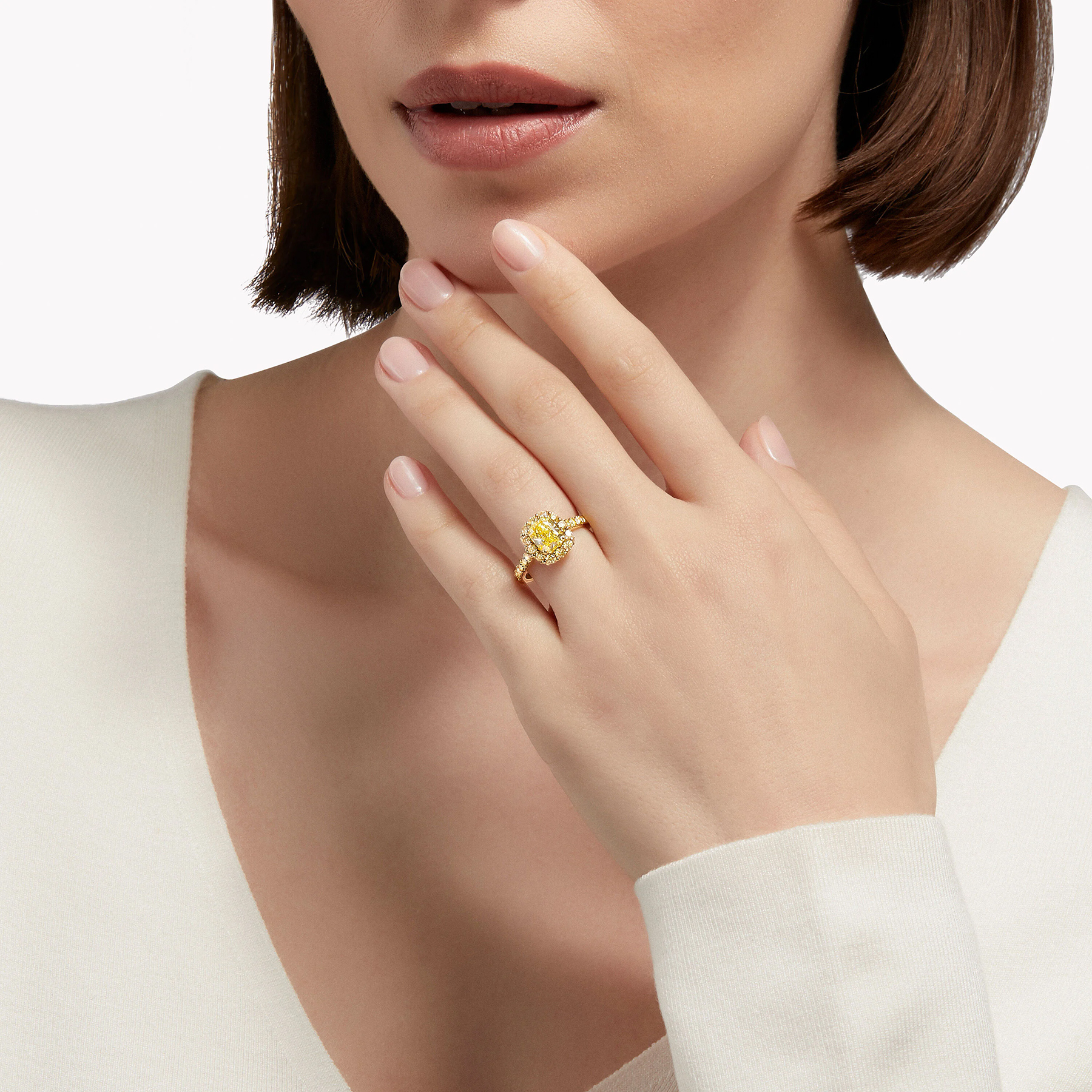 У центрі розкішного кільця Icon виблискує рідкісний діамант подушкоподібного огранювання відтінку Fancy Vivid Yellow - один із найнасиченіших і найяскравіших тонів у природі. Його м'які, плавні обриси поміщені в оправу з жовтого золота і обрамлені ореолом із діамантів паві в сонячних тонах, які підкреслюють сяйво та глибину кольору центрального каменю. Майстерно підібрані і бездоганно ограновані камені створюють ефект живого, мерехтливого світла, немов промені сонця, впіймані в золото.