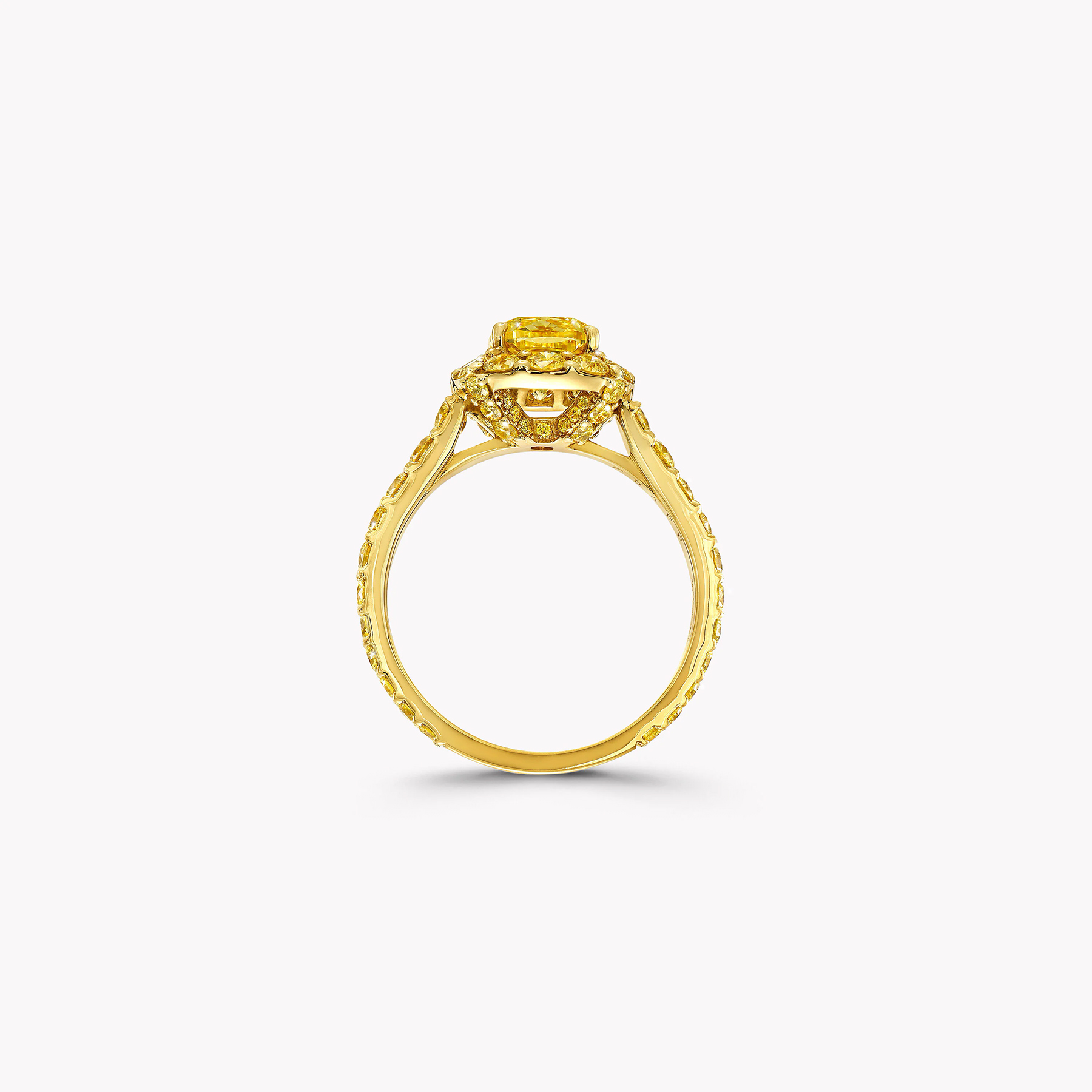 Чудове кільце Icon з діамантами огранювання «кушон» та жовтим паве загальною масою близько 3,04 карата, прикрашене сертифікованим діамантом Fancy Vivid Yellow вагою 1,57 карата, – це втілення сонячного сяйва та вічної елегантності Graff.