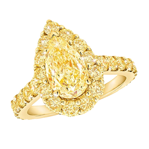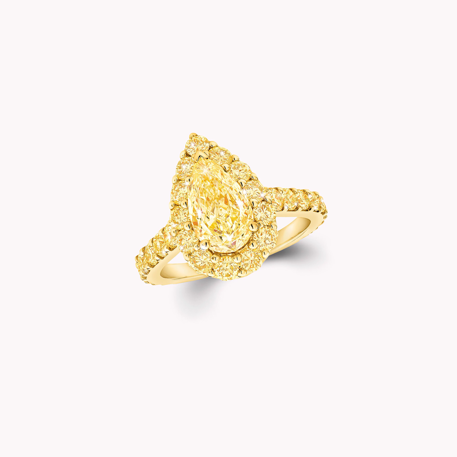Чарівне кільце Icon з грушоподібним діамантом Fancy Vivid Yellow і ореолом із жовтих діамантів паве - це втілення сонячного світла та вічної елегантності, символ радості, пристрасті та майстерності Graff.