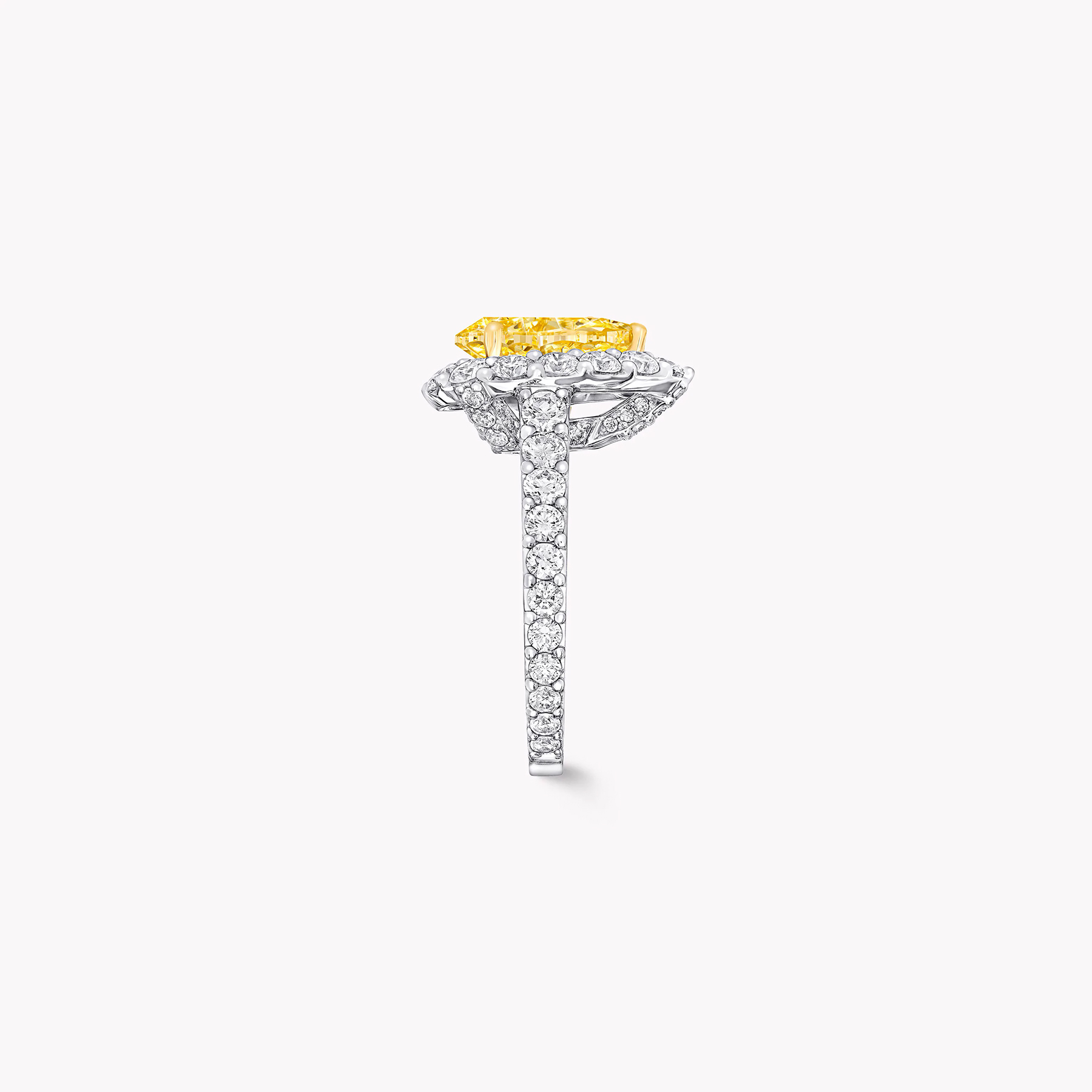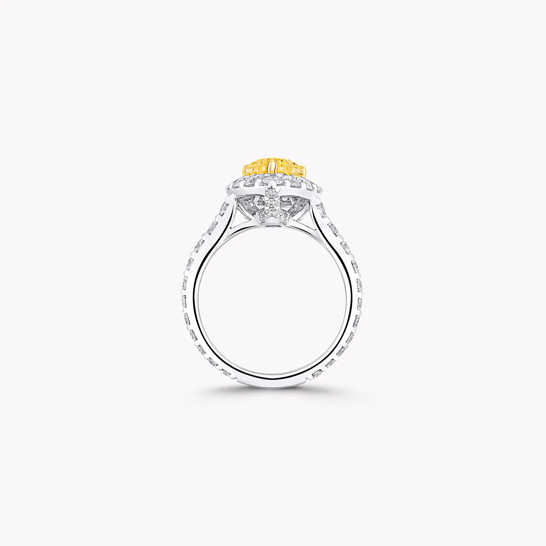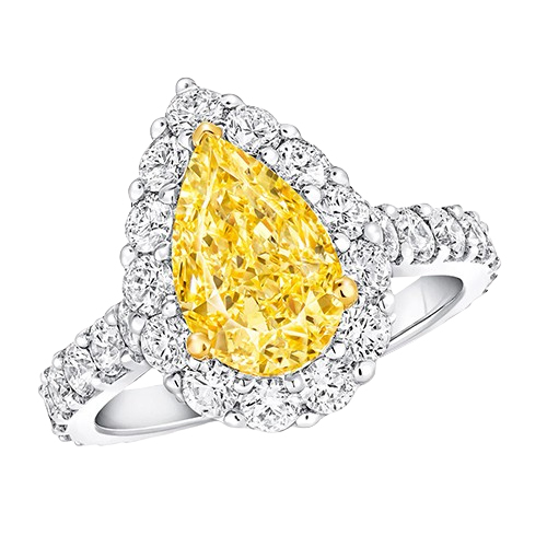 Вишукане кільце Icon з жовтим діамантом грушоподібної ограновування та білим паве загальною масою близько 3,20 карата, прикрашене сертифікованим каменем Fancy Intense Yellow вагою 1,77 карата, — це ювелірний шедевр, що втілює сяйво у вигляді сонця.