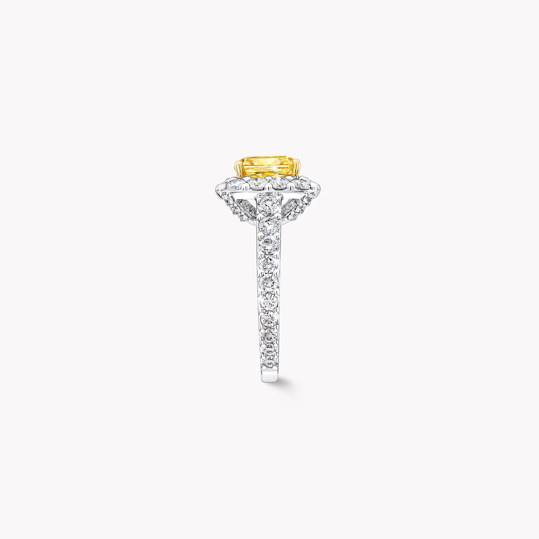 Яскраве, живе кільце Icon з діамантом огранювання «радіант» та білим паве загальною масою близько 2,44 карата, прикрашене сертифікованим каменем Fancy Vivid Orangy Yellow вагою 1,01 карата, – це втілення енергії, пристрасті та вічного сяйва Graff.