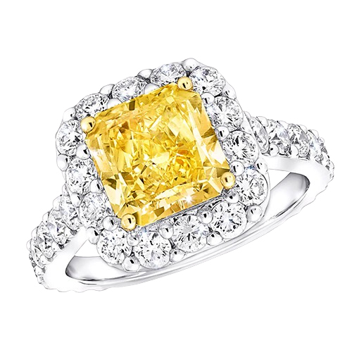 У центрі кільця Icon сяє рідкісний діамант ограновування «радіант» відтінку, що зачаровує Fancy Vivid Orangy Yellow — насиченого, теплого кольору, в якому поєднуються відблиски сонця і золота. Унікальне модифіковане огранювання «радіант», яке славиться своєю винятковою грою світла, розкриває глибину і внутрішній вогонь каменю. Навколо центрального діаманта мерехтить ореол з білих діамантів паве, що тонко підкреслюють яскравість і насиченість його кольору.
