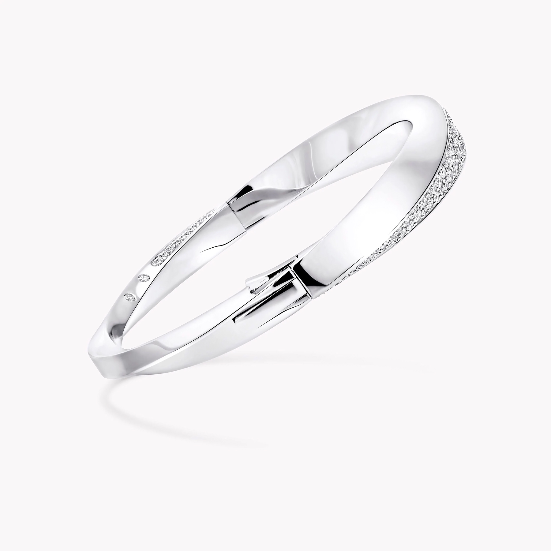 Вишуканий браслет Spiral із білого золота огортає зап'ястя м'яким вихором світла та блиску. Поверхня прикраси усипана градуйованими діамантами круглого огранювання паві, які здаються нерозважно розсипаними по витонченому вигнутому контуру. Гнучка форма браслета створює відчуття плавного руху, відбиваючи світло при кожному повороті руки.