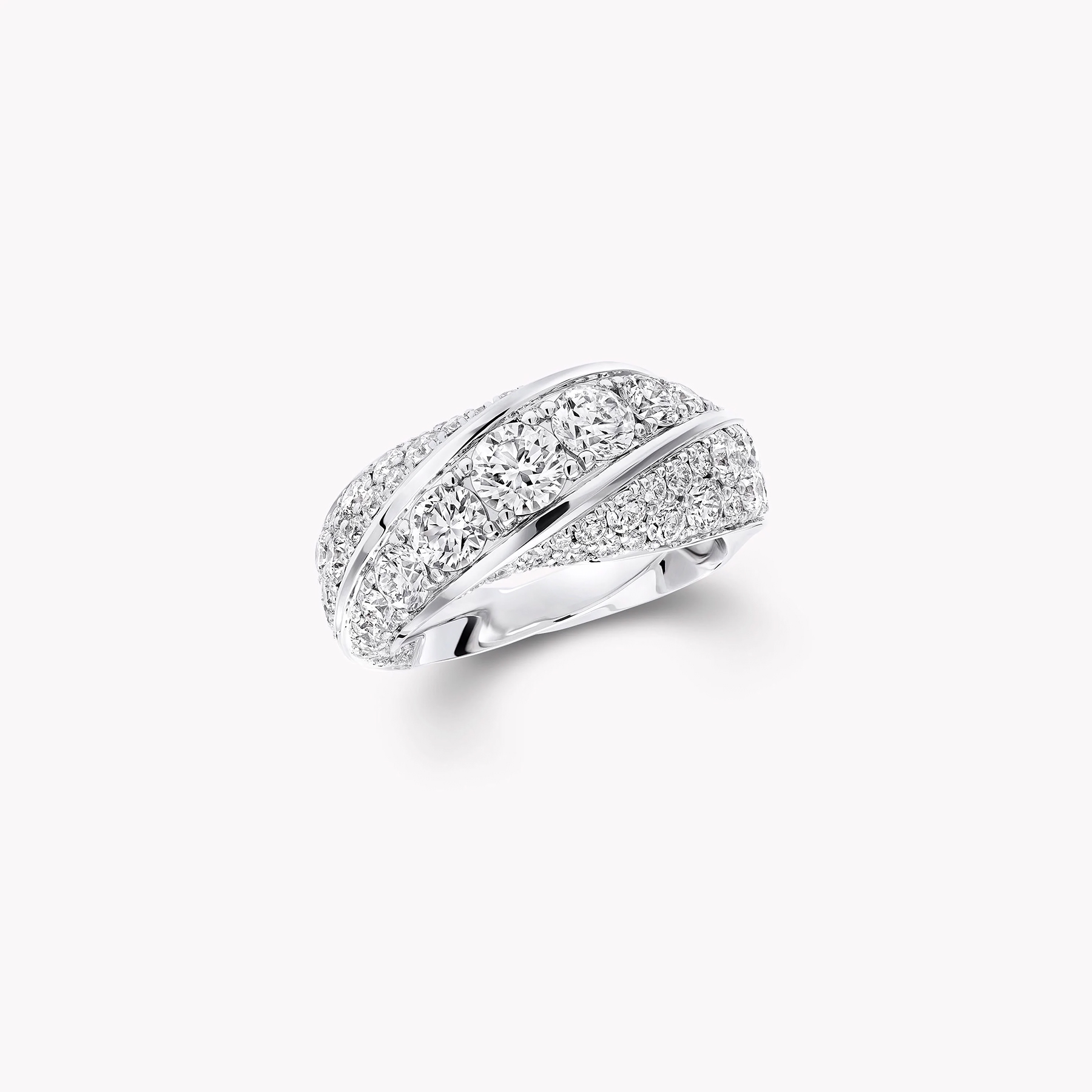 Уособлюючи вічність і безперервний рух, кільце Spiral із білого золота витончено закручується навколо пальця, утворюючи блискучу спіраль світла. Поверхня прикраси усипана діамантами круглого огранювання паві, майстерно закріпленими ювелірами Graff, щоб кожен камінь відбивав і посилював блиск сусідніх, створюючи ефект нескінченного сяйва.